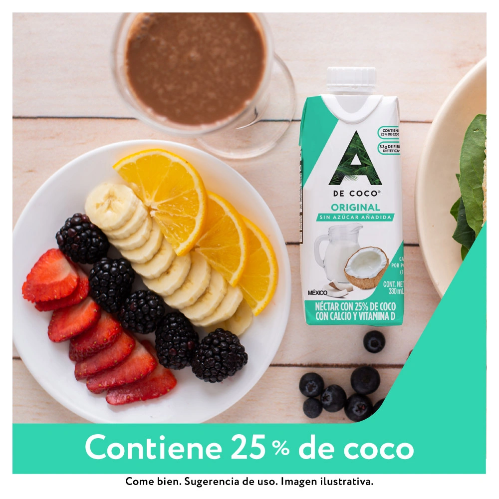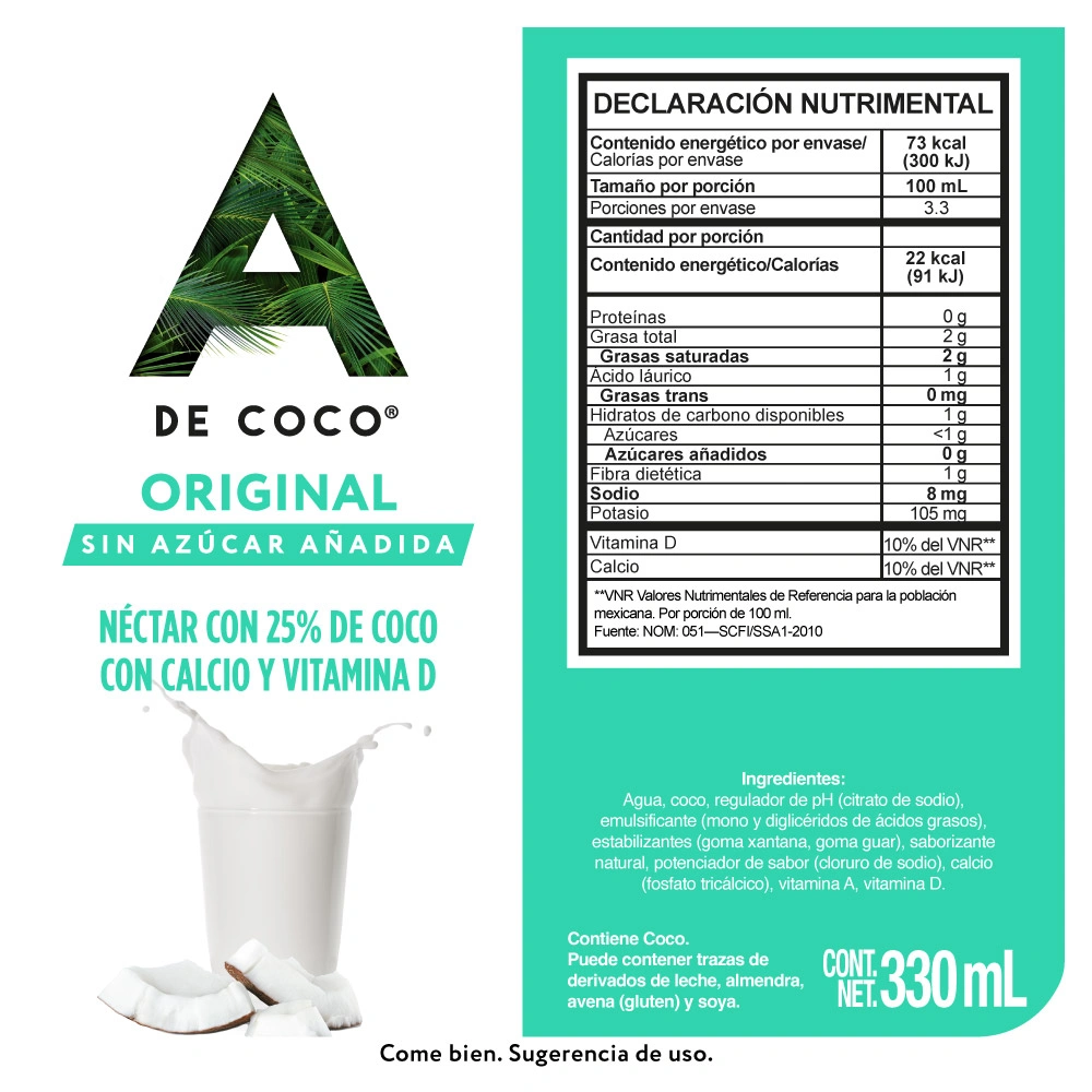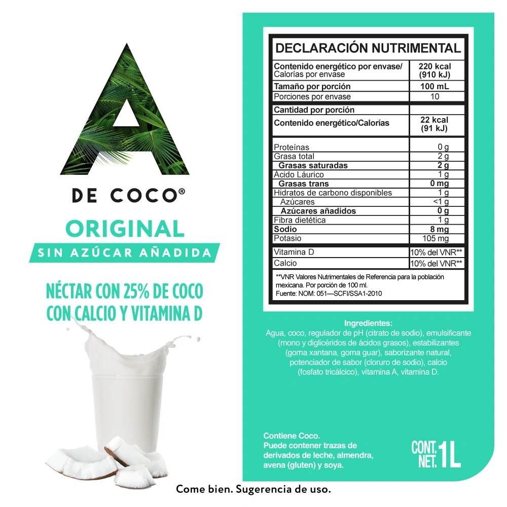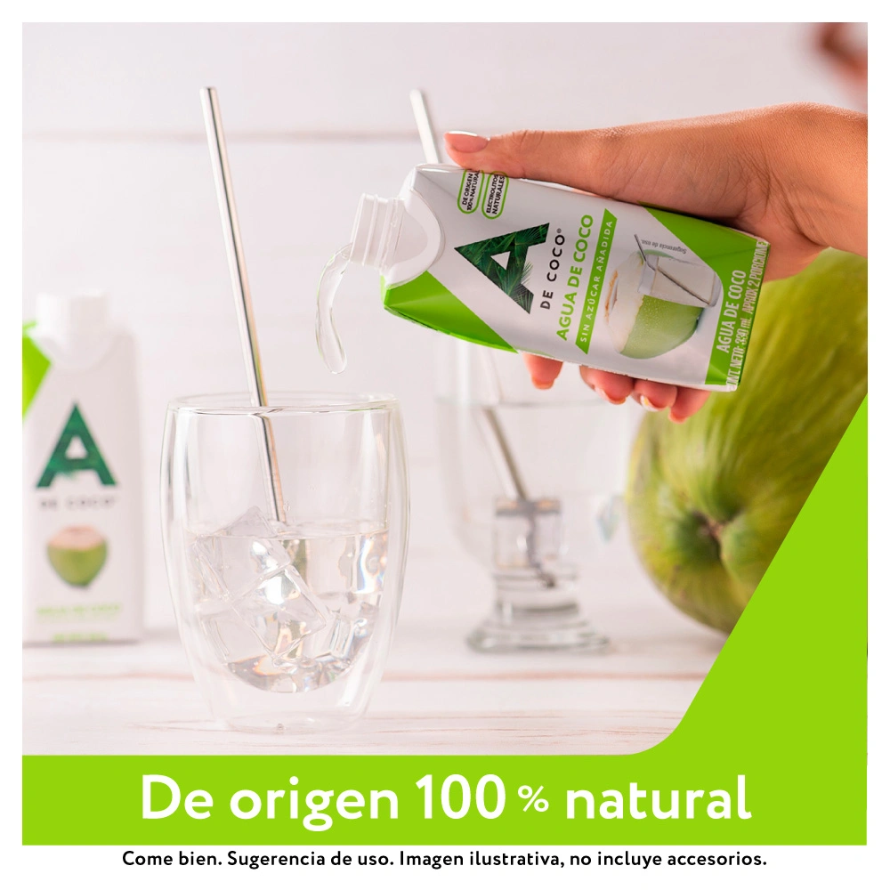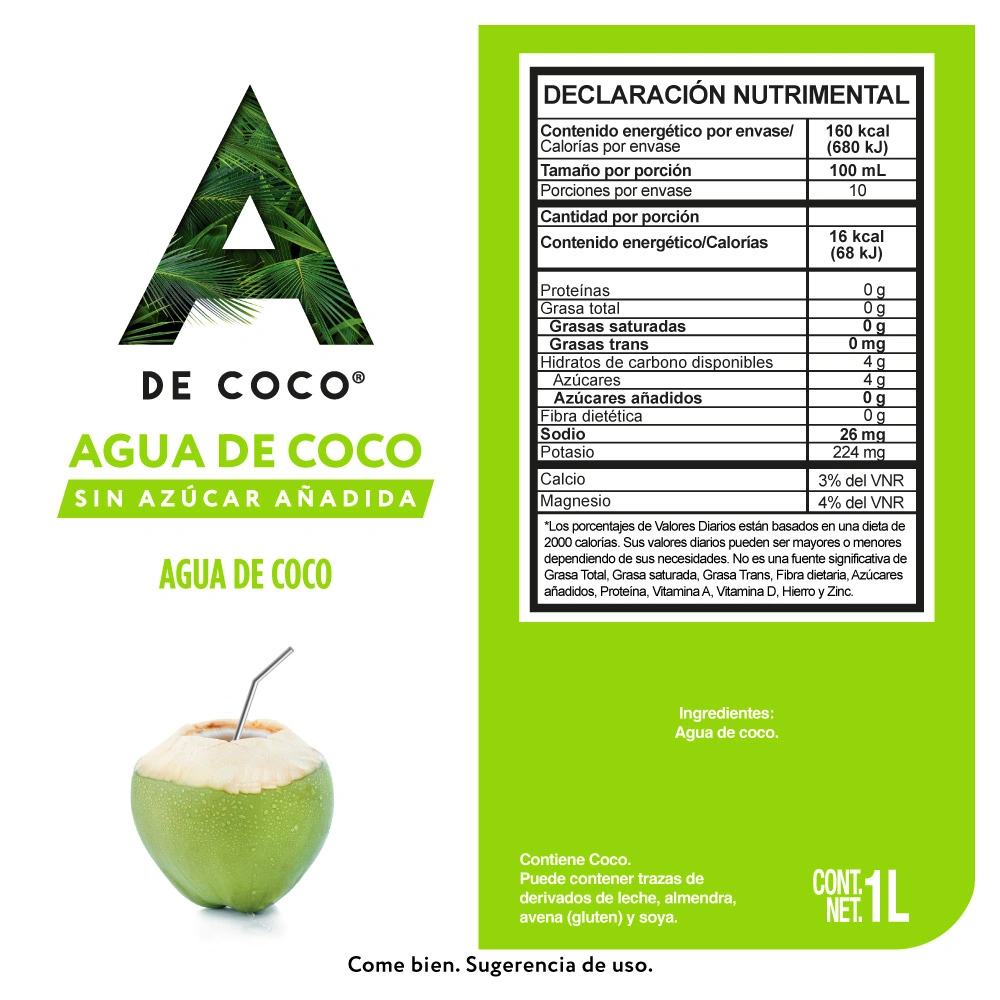 Agua de coco sin diluir, sin saborizantes ni conservadores añadidos.