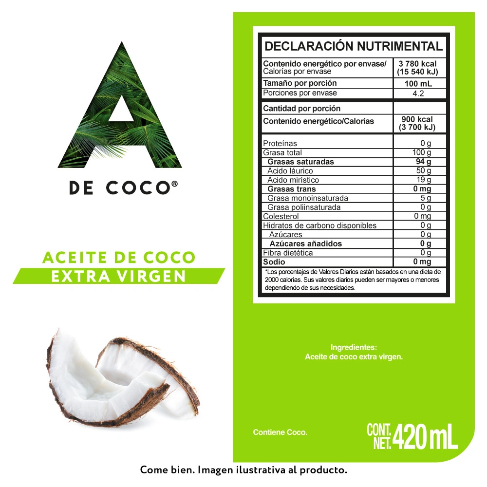 Aceite de coco extra virgen. Extraído en prensa fría.