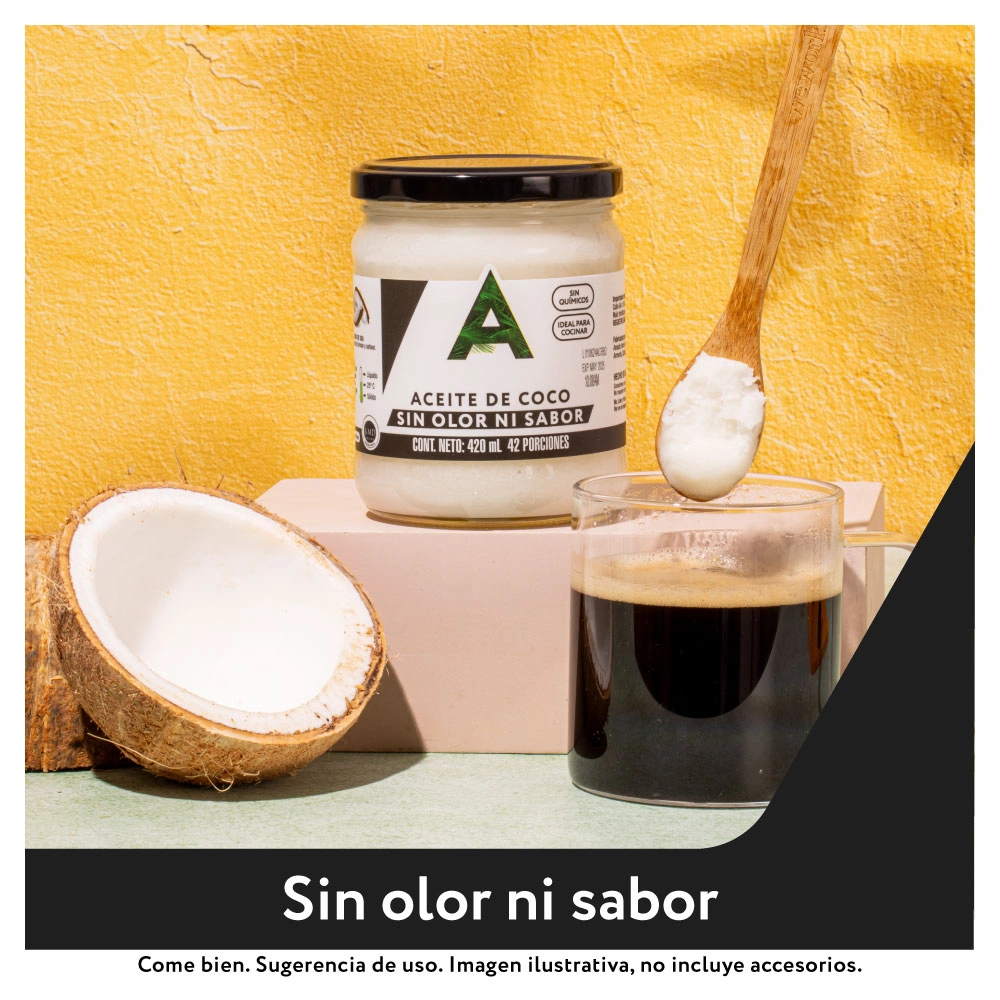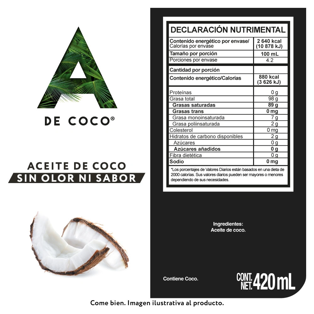 Aceite de coco sin olor, ni sabor. Extraído en prensa fría.