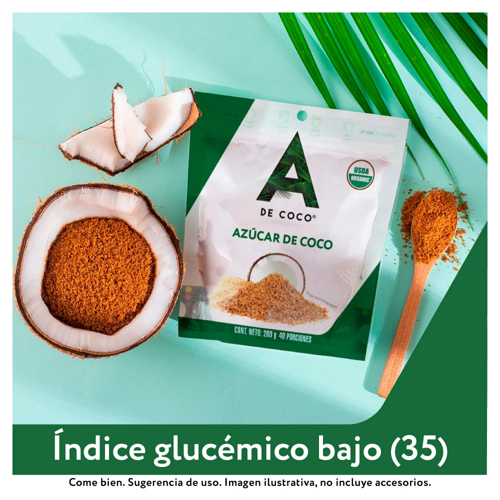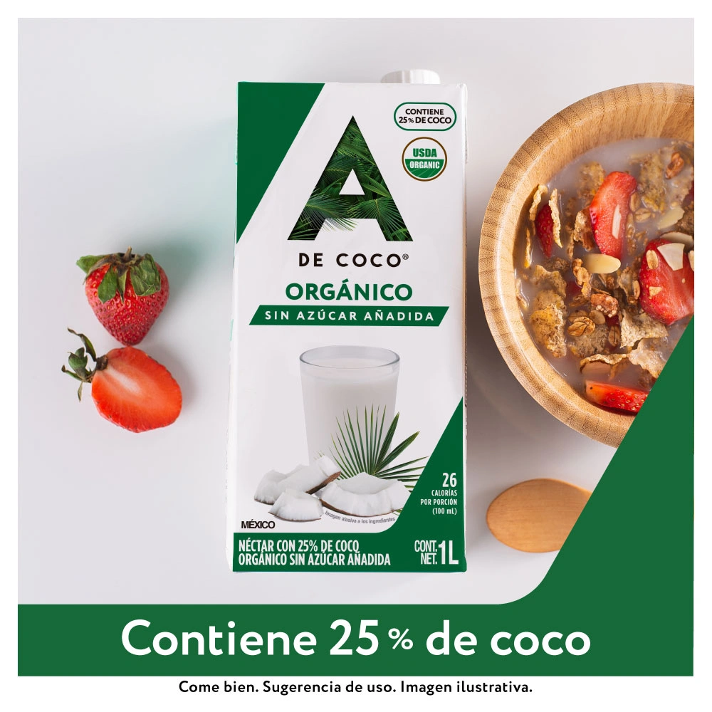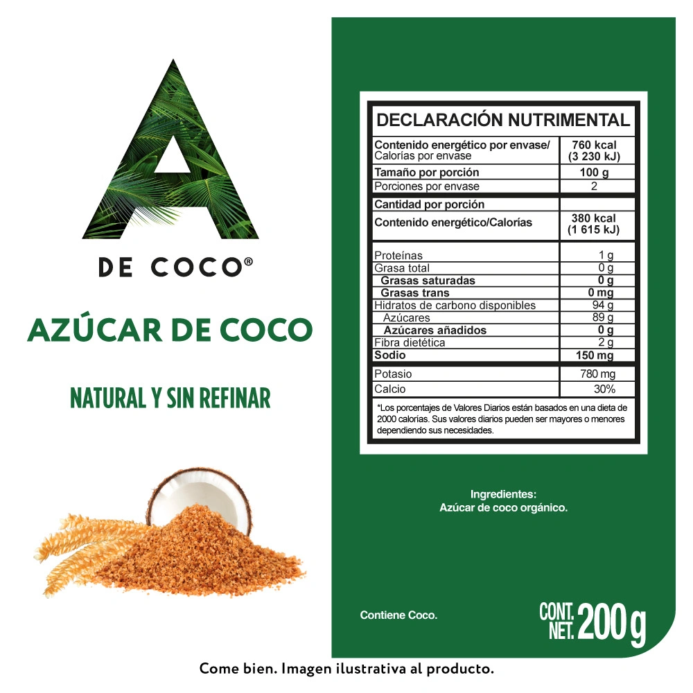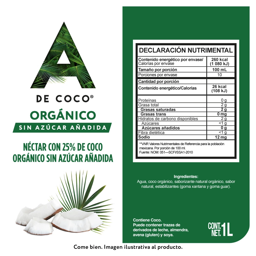 Néctar de coco Orgánico, sin azúcar añadida. Sin gluten, sin lactosa y sin colesterol.