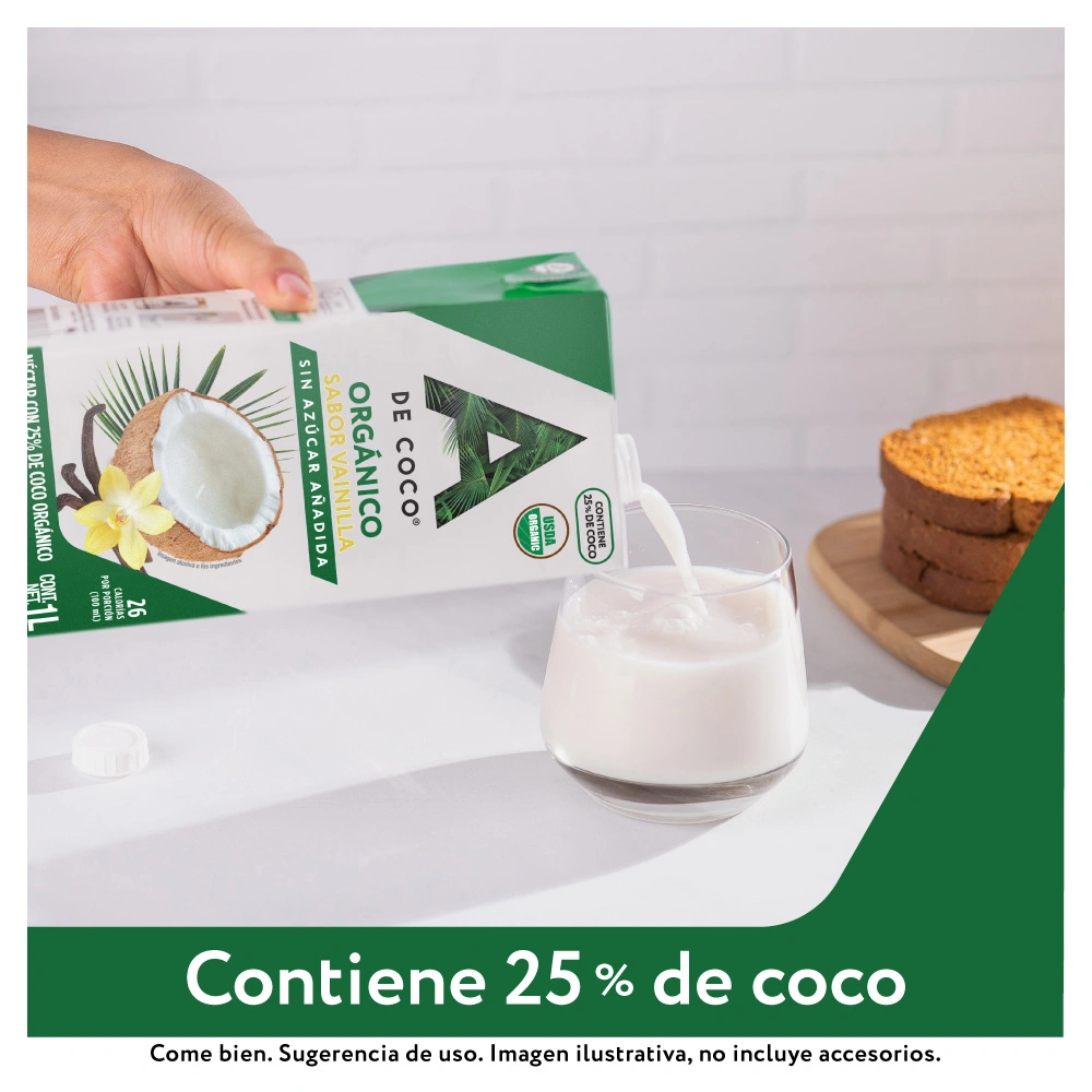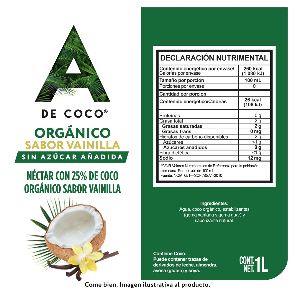Néctar de coco Orgánico sabor vainilla, sin gluten y sin lactosa.