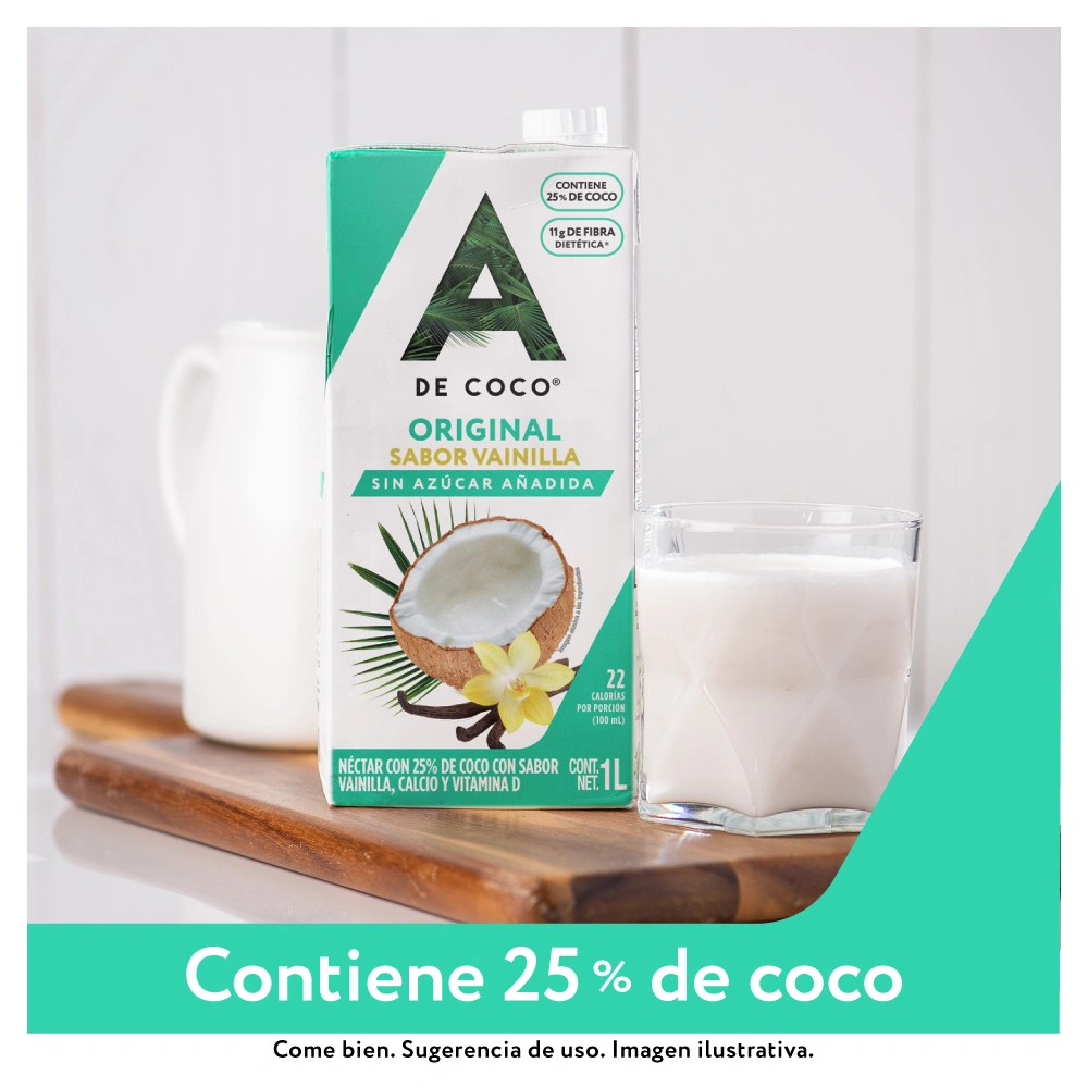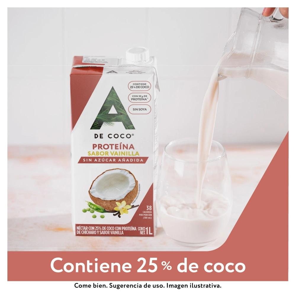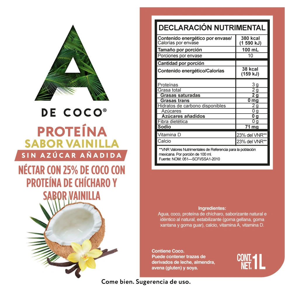 Néctar de coco con proteína sabor vainilla, sin gluten y sin lactosa.