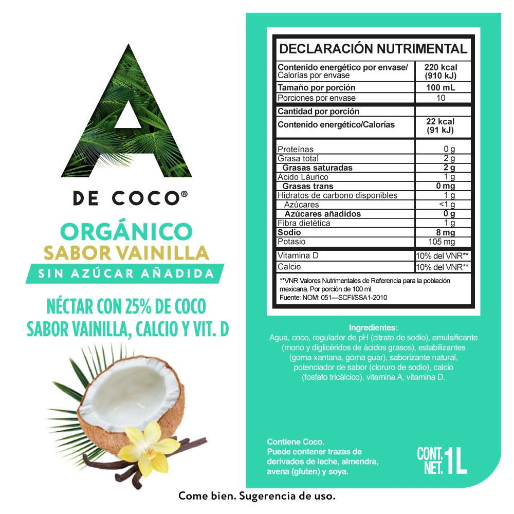 Néctar de coco sabor vainilla, sin gluten y sin lactosa.