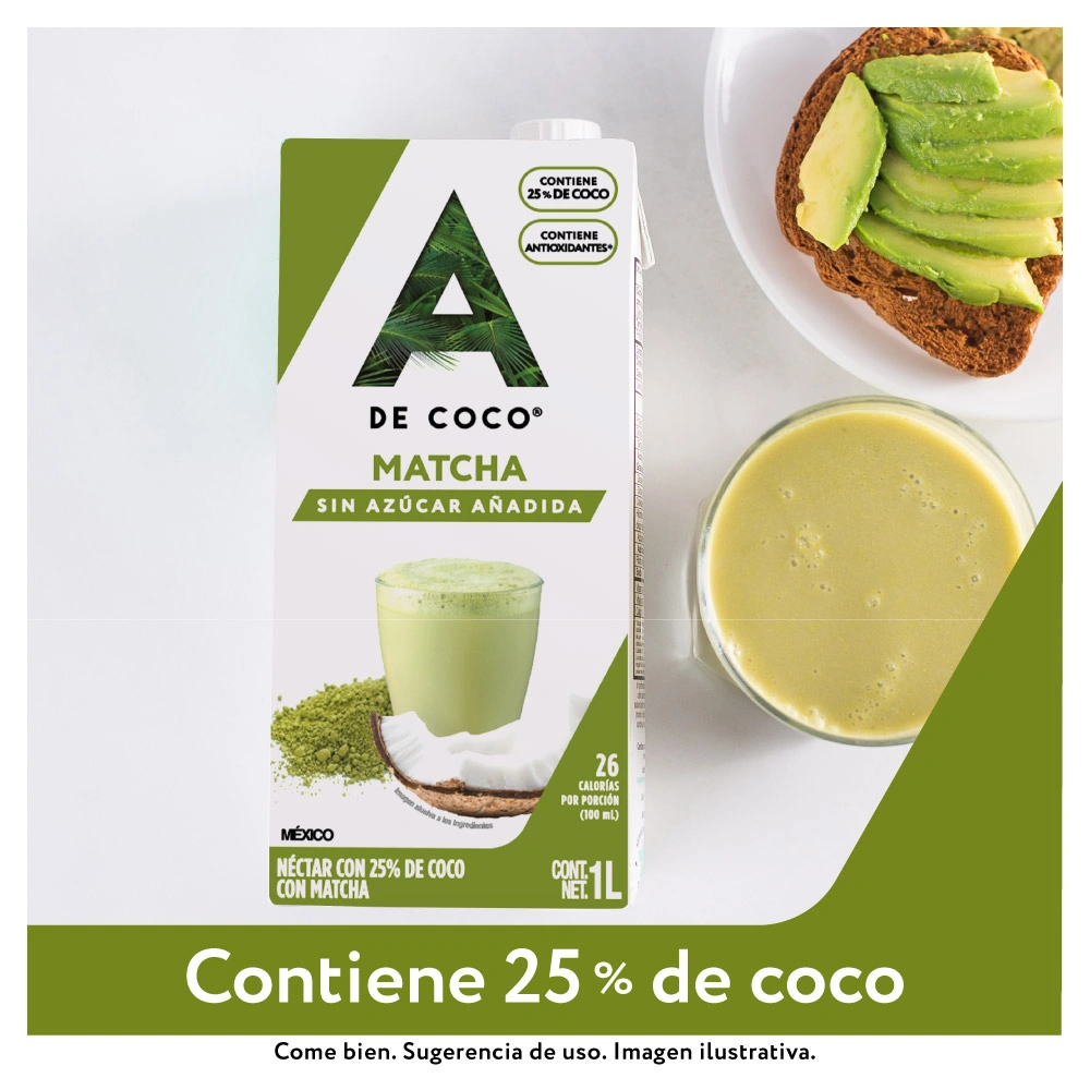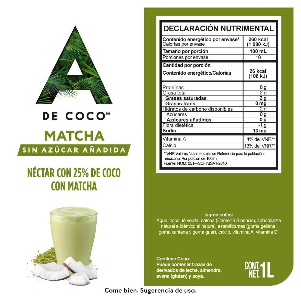 Néctar de coco con matcha, sin gluten y sin lactosa.